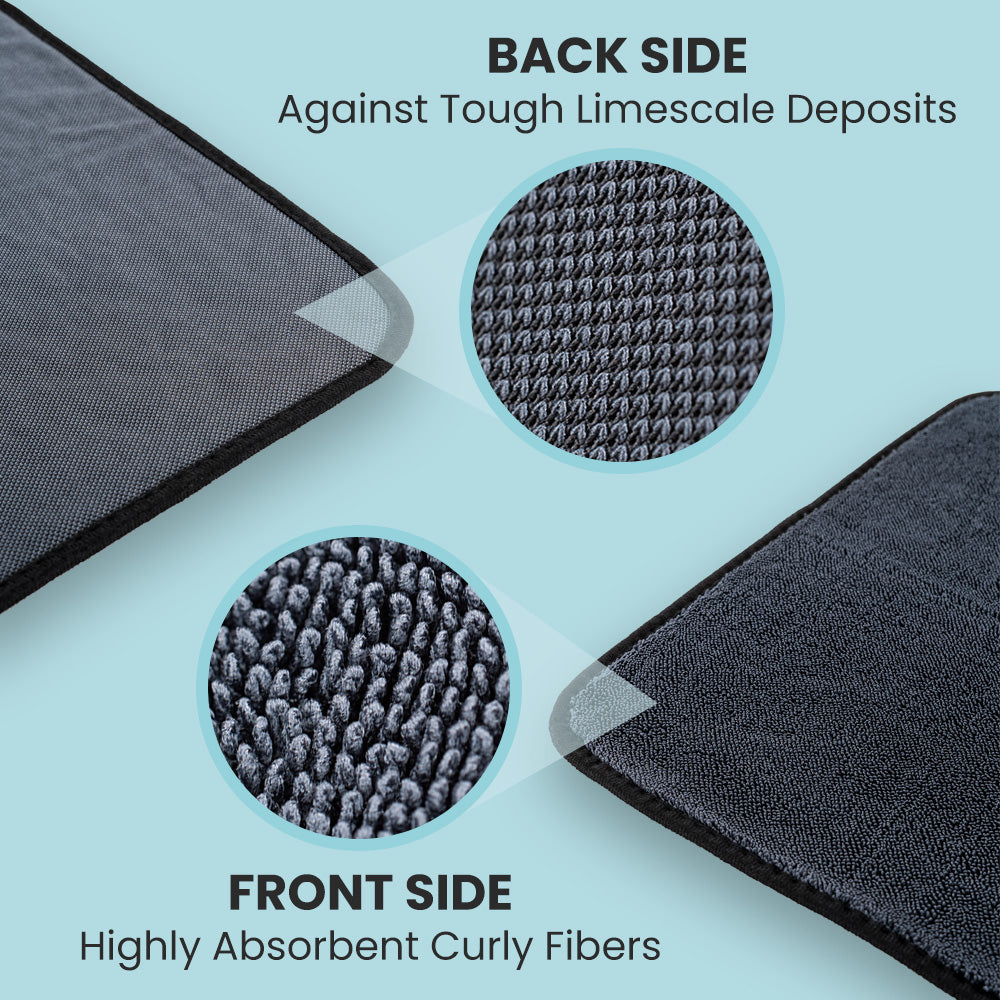 Professional hotel cleaners figured this out a long time ago. When you're responsible for dozens of bathrooms every single day, the only standard that works is complete moisture elimination, removing water entirely from every surface so there's nothing left behind to dry into spots or build into scale. The Shiny Bath™ Drying Towel was engineered on exactly this principle. Its dual-fiber construction combines a textured absorption side that pulls moisture completely from glass, tiles, and fixtures, with a smooth protective side that leaves a light barrier so water beads off for hours, rather than settling into the white haze you're used to scrubbing away.